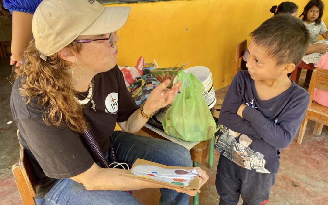 Foto: Mariana Pérez, voluntaria mexicana, con un niño de la escuela Rayito de sol en Olanchito | © San Jorge Multimedios.